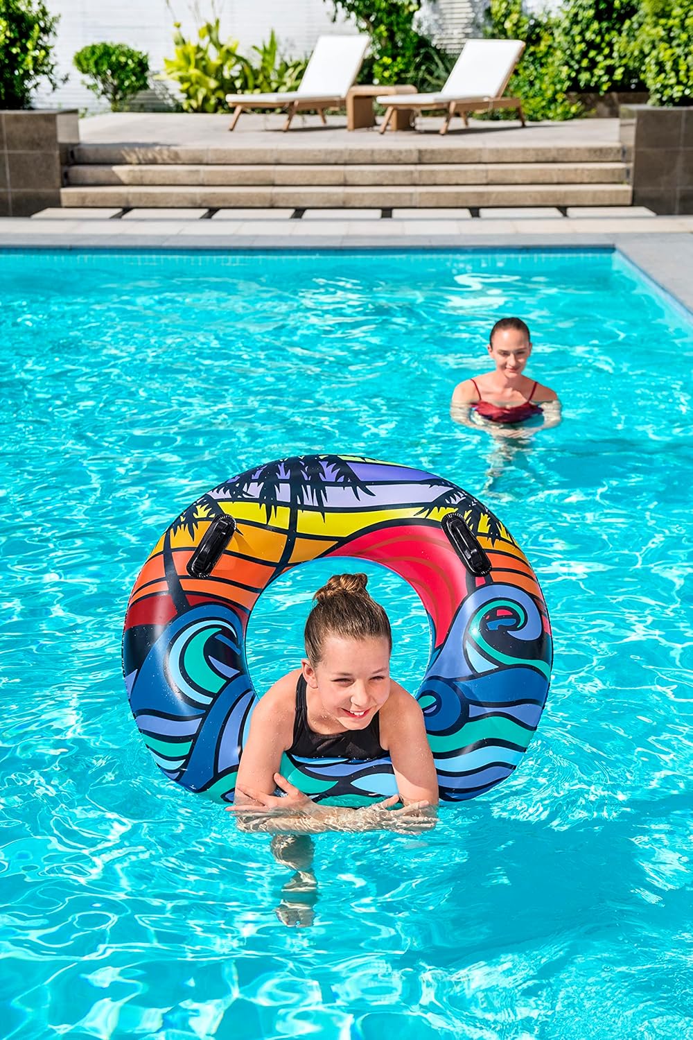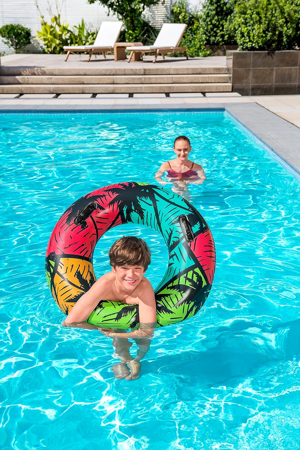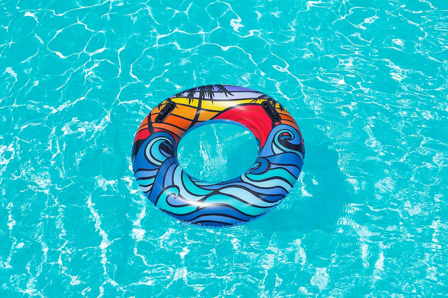 - Anillo de natación inflable: es el juguete de piscina perfecto para relajarse en un día caluroso. El diseño tropical único es ideal para días de playa o piscina. El anillo de natación más llamativo es un accesorio esencial para llevar de día festivo contigo
