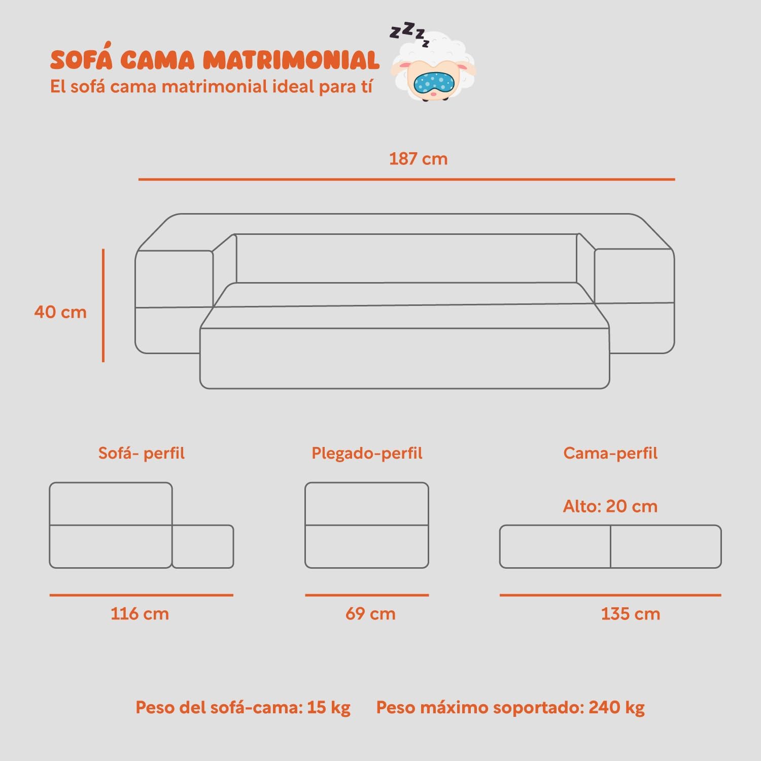 - MEDIDAS PERFECTAS: Sus dimensiones son ideales para adaptarse a todo tipo de habitación, en cualquiera de sus posiciones. Medidas sofá: 116x187x40 cm. Medidas sillón: 69x187x40 cm. Medidas cama: 135x187x20 cm.