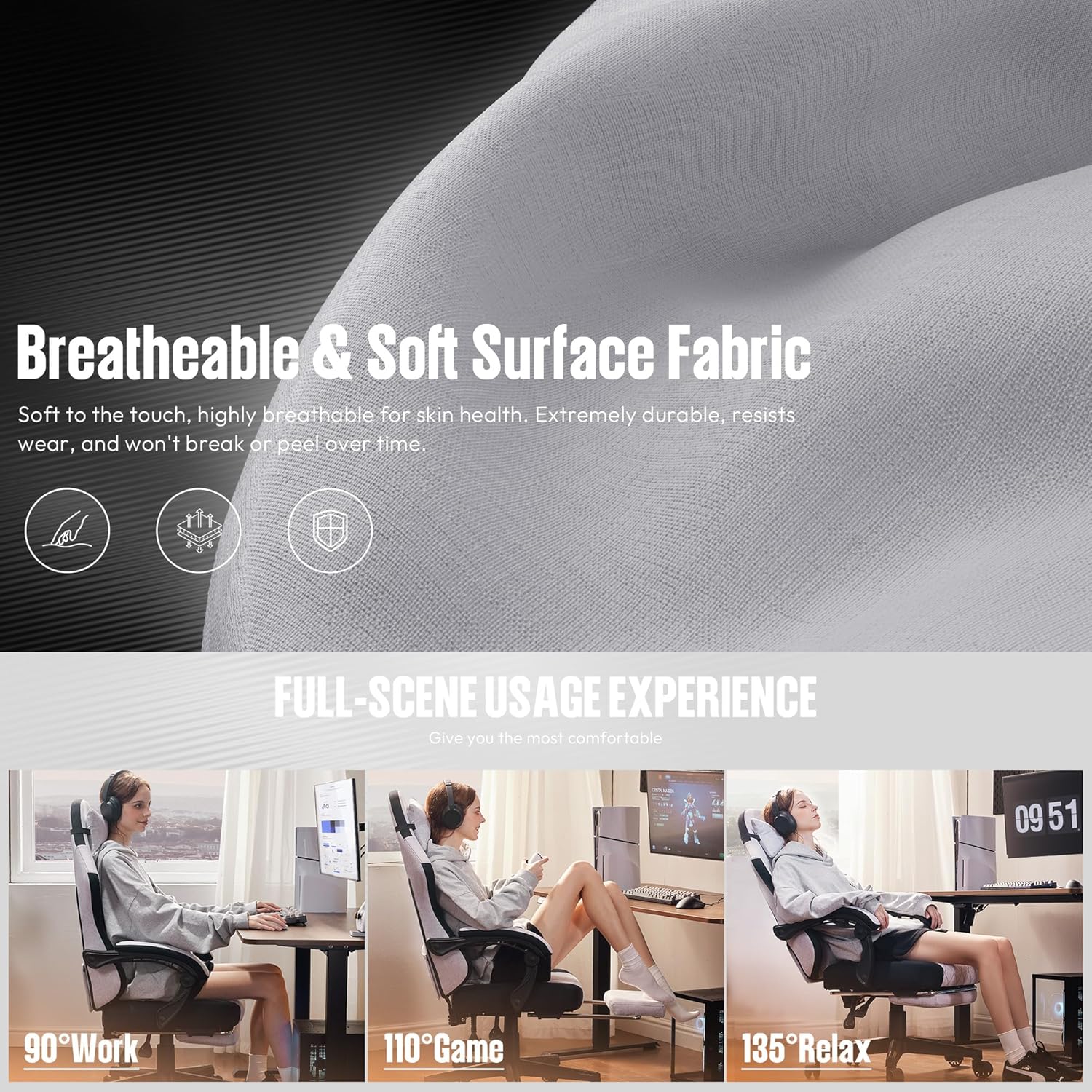 - tela altamente transpirable: esta silla de juego utiliza un tela de malla transpirable de desarrollo propio con acolchado avanzado, que ofrece el doble de transpirabilidad de los materiales normales. Te mantiene fresco y cómodo incluso en días calurosos. La alta resistencia de la tela proporciona un fuerte apoyo, por lo que es más fácil mantenerse concentrado y trabajar de manera eficiente.