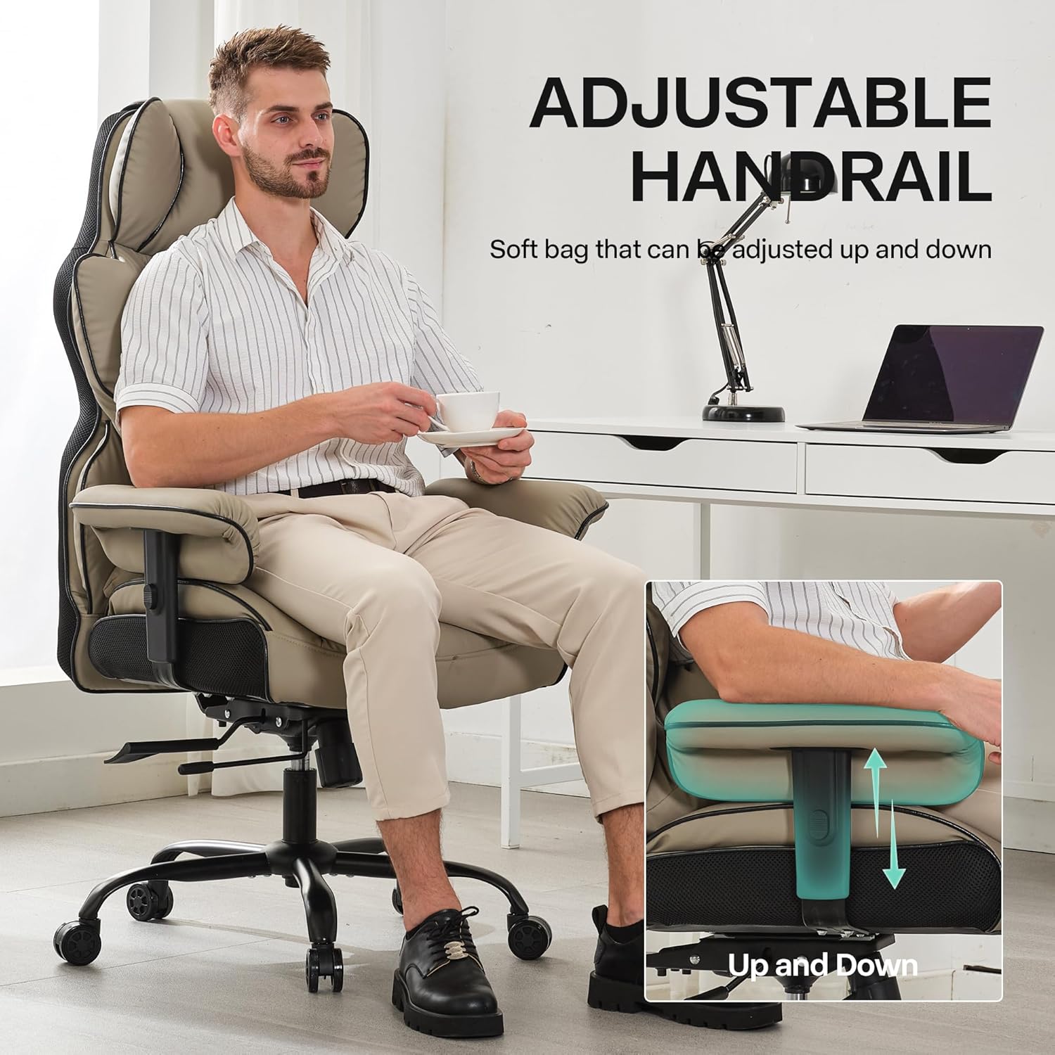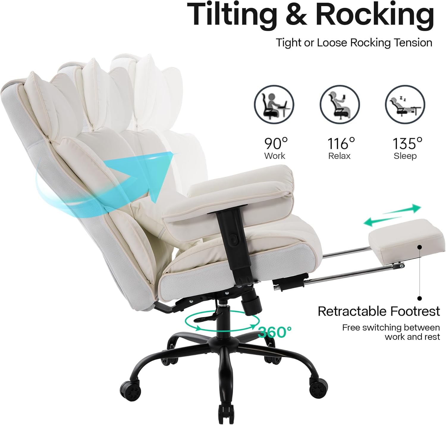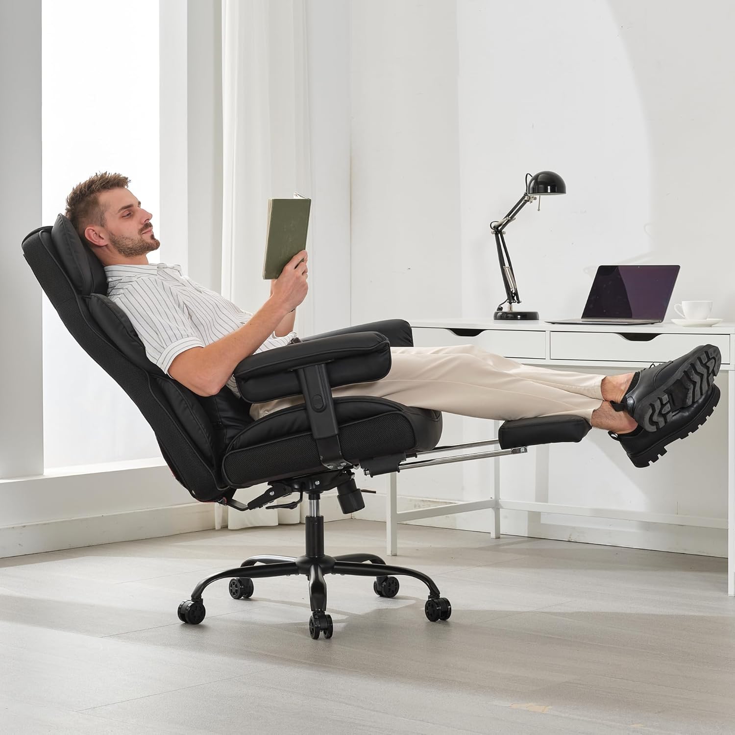 - 3 Ajuste multifuncional: con una robusta capacidad de peso de 400 libras, la silla reclinable de oficina ofrece ángulos de reclinación ajustables, reposabrazos, altura del asiento y un reposapiés retráctil para un ajuste personalizado. Su función giratoria de 360 grados proporciona un fácil acceso a todo tu espacio de trabajo, ajusta fácilmente el ángulo de inclinación del respaldo hasta 135 grados y disfruta de la comodidad del reposapiés retráctil acolchado suave. Ya sea que estés trabajando, jugando o tomando una siesta rápida, esta silla de computadora reclinable ofrece la mezcla perfecta de apoyo y relajación