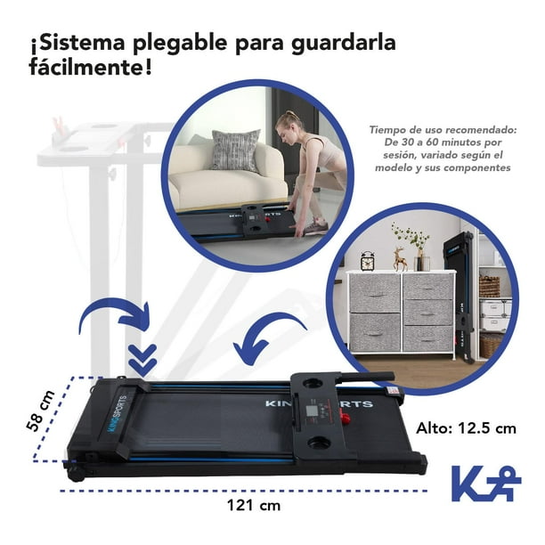 - Medidas generales (LAxANxAL): 120x60x92 cm; Plegada: 121x58x12.5 cm. Medidas aproximadas de la cinta para correr: 100x39 cm. Peso máximo soportado: 110 kg.