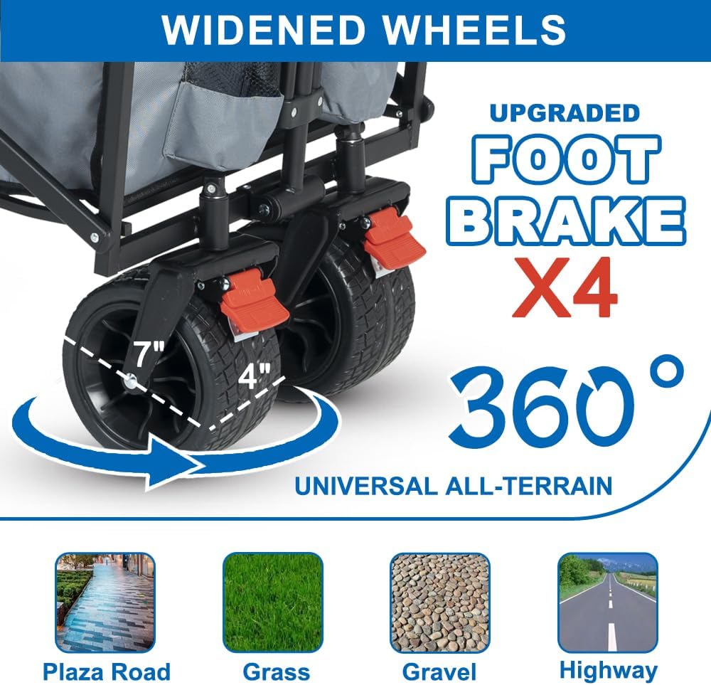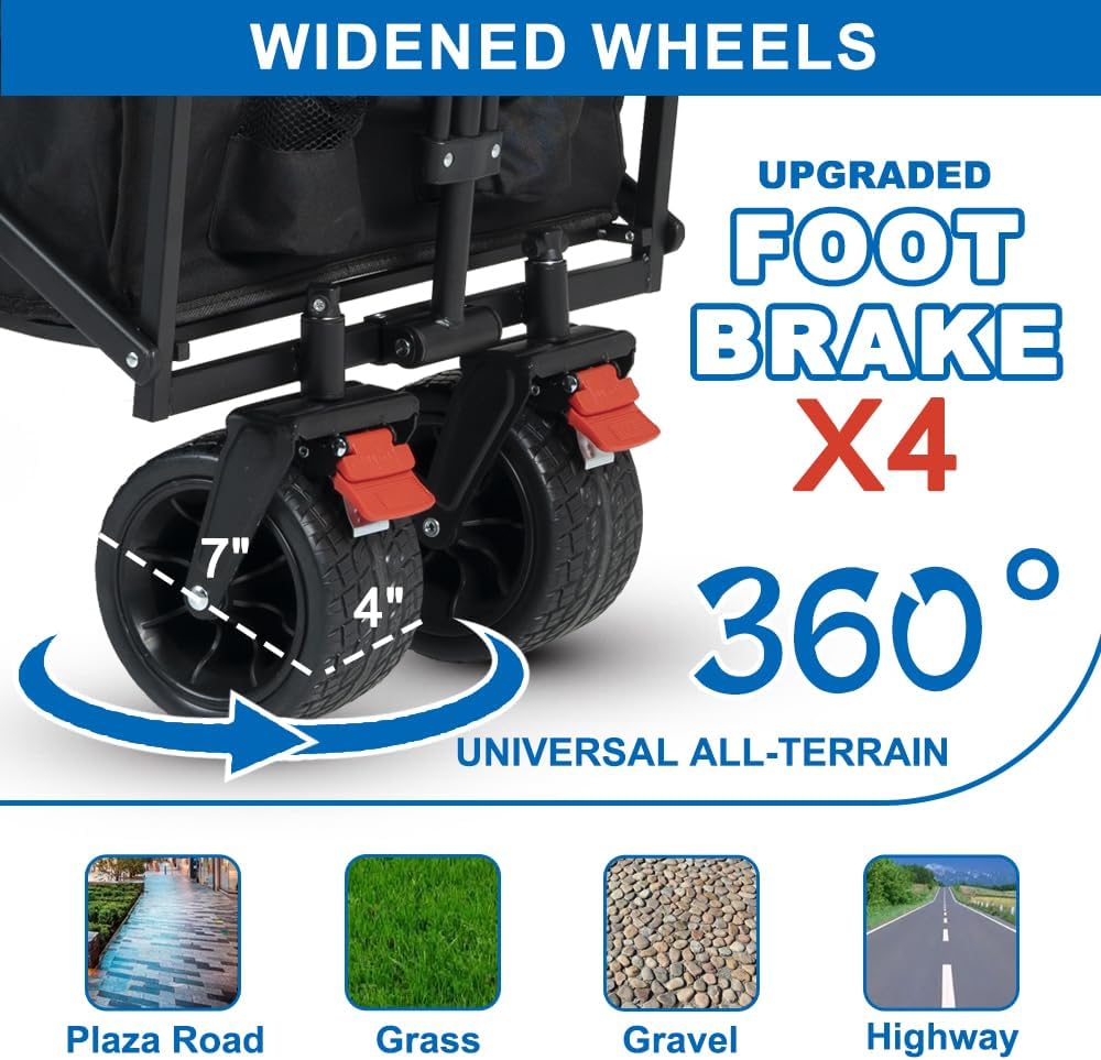 - Carros plegables estables y seguros: ruedas universales de 360° de 4 pulgadas ensanchadas y de 7 pulgadas de diámetro, sin importar en la playa, césped, carretera de grava o malas condiciones de carretera, puede conducir de forma estable y ofrecerte una experiencia más cómoda. Equipado con frenos de 4 pies, puede ayudarnos a controlar el carrito más fácilmente y mantener la estabilidad del carrito, mejorando la seguridad de nosotros.