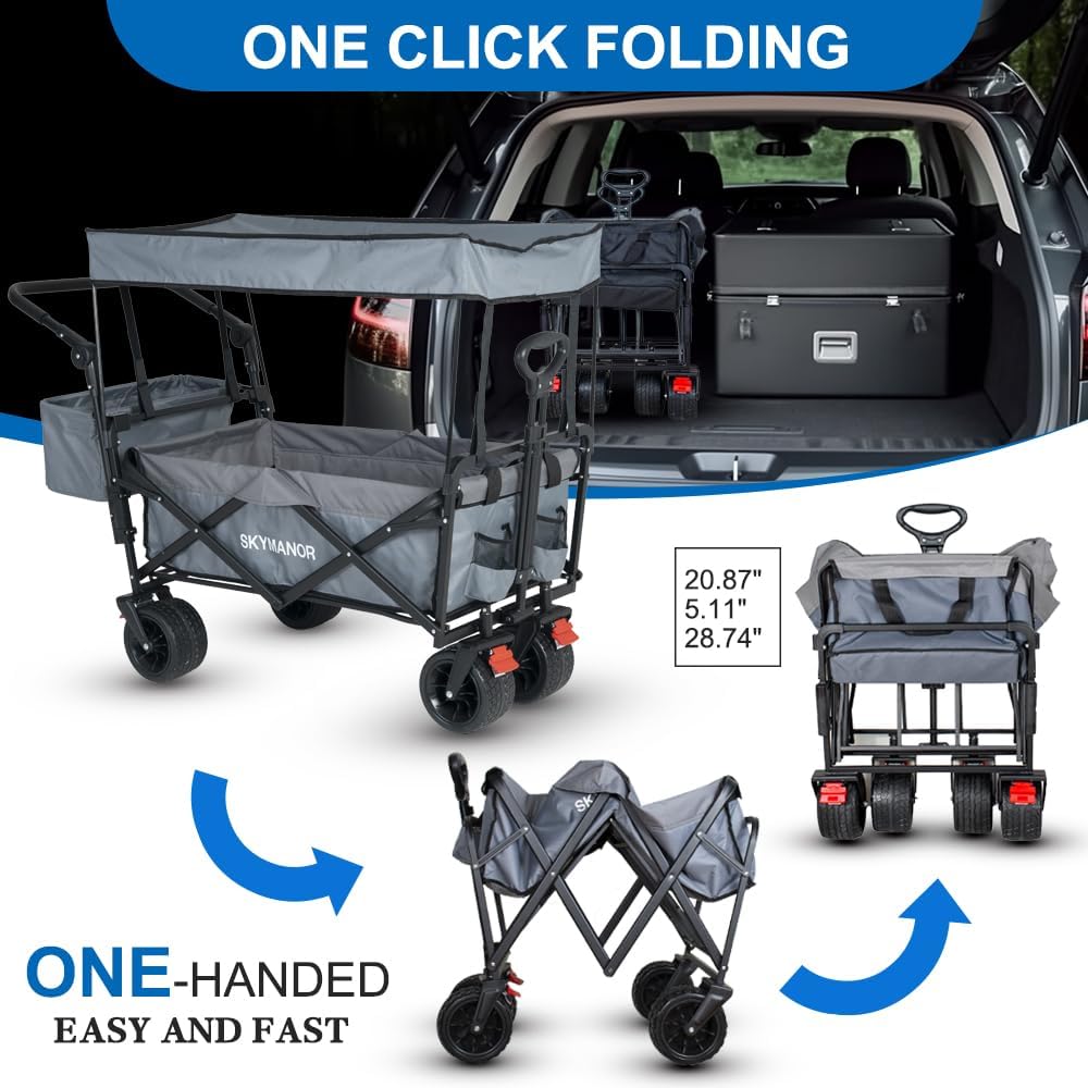- Carro plegable con ruedas grandes: las grandes ruedas anchas para todo terreno se adaptan a diferentes superficies de carretera, como barro, arena, carreteras de grava, etc. Las ruedas delanteras pueden girar 360 grados, fácil de seguir adelante y girar. Además, las asas de tracción y empuje son ajustables para diferentes alturas de personas. Cualquiera que sea la dirección que quieras ir, no tendrás problemas para mover este carrito.