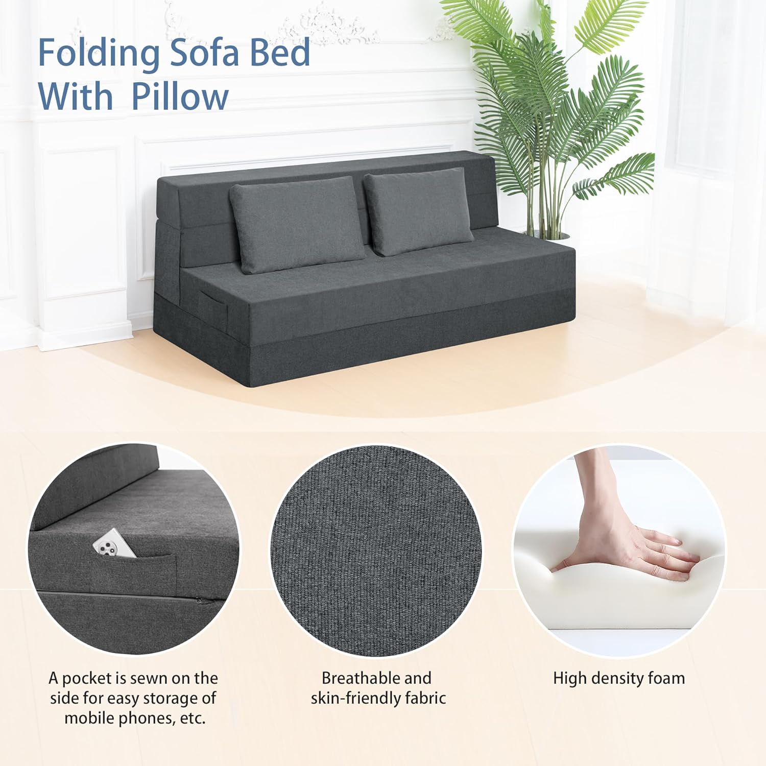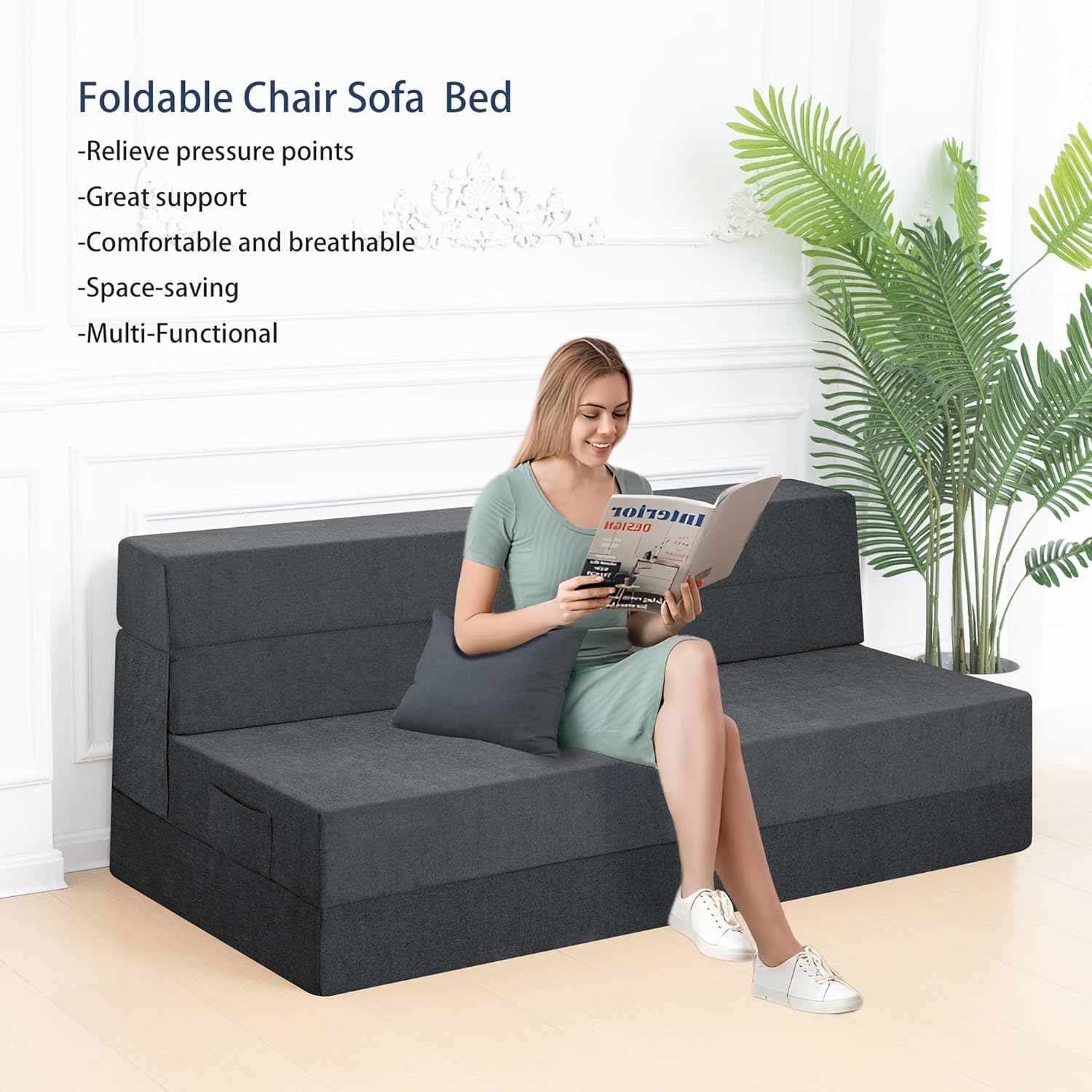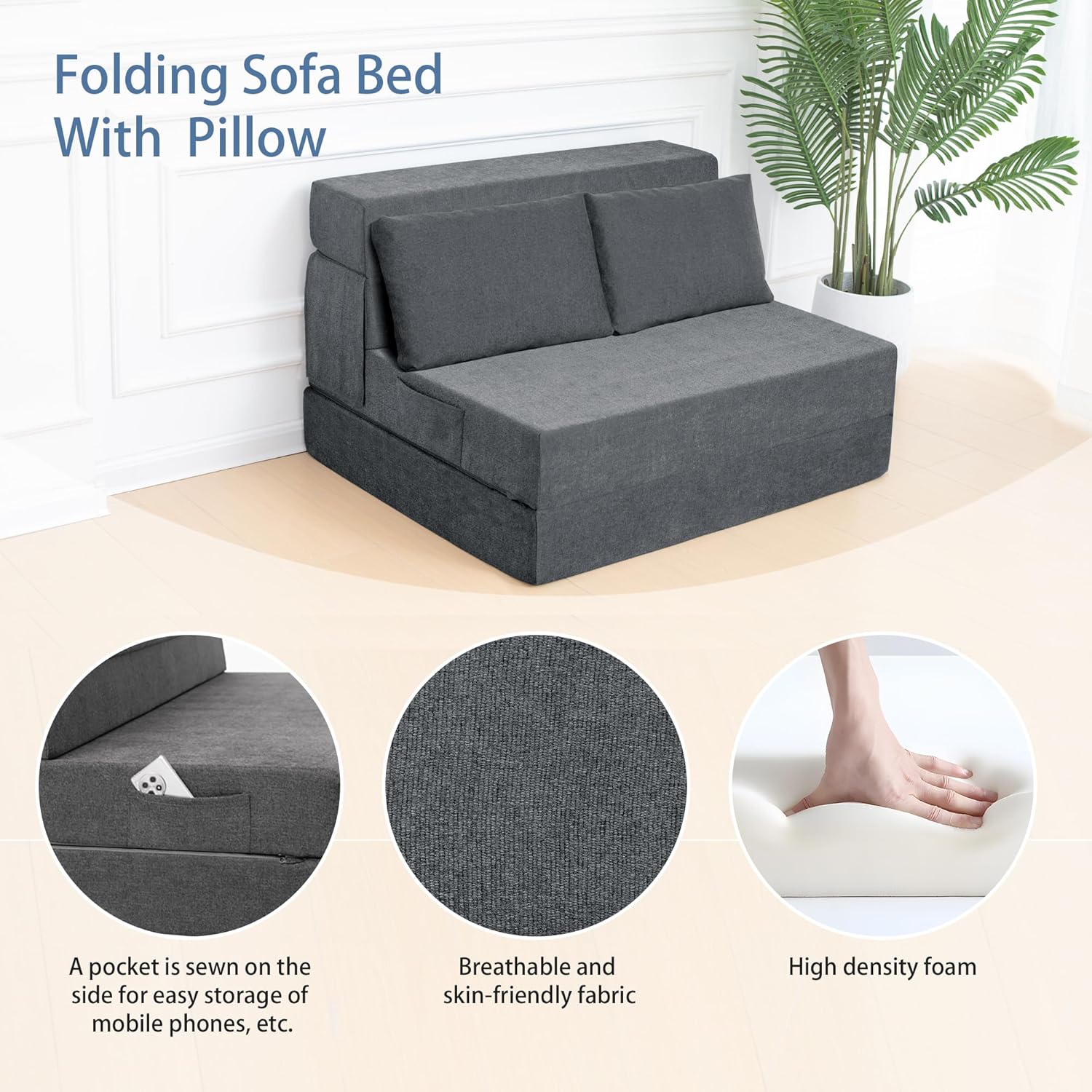 - Tela y espuma de alta calidad: la tela transpirable gris oscuro es elegante y elegante, agradable al tacto y transpirable. El sofá cama de espuma de alta densidad es muy cómodo, suave y de apoyo, por lo que no se "hundir" ni sentirá el piso duro.