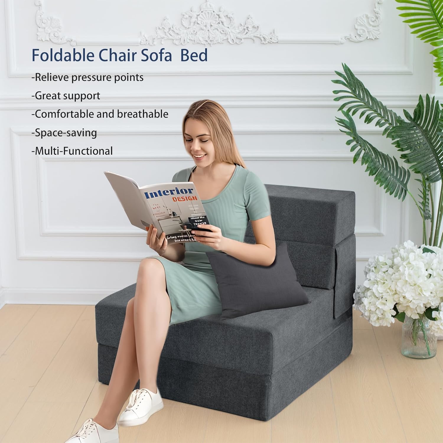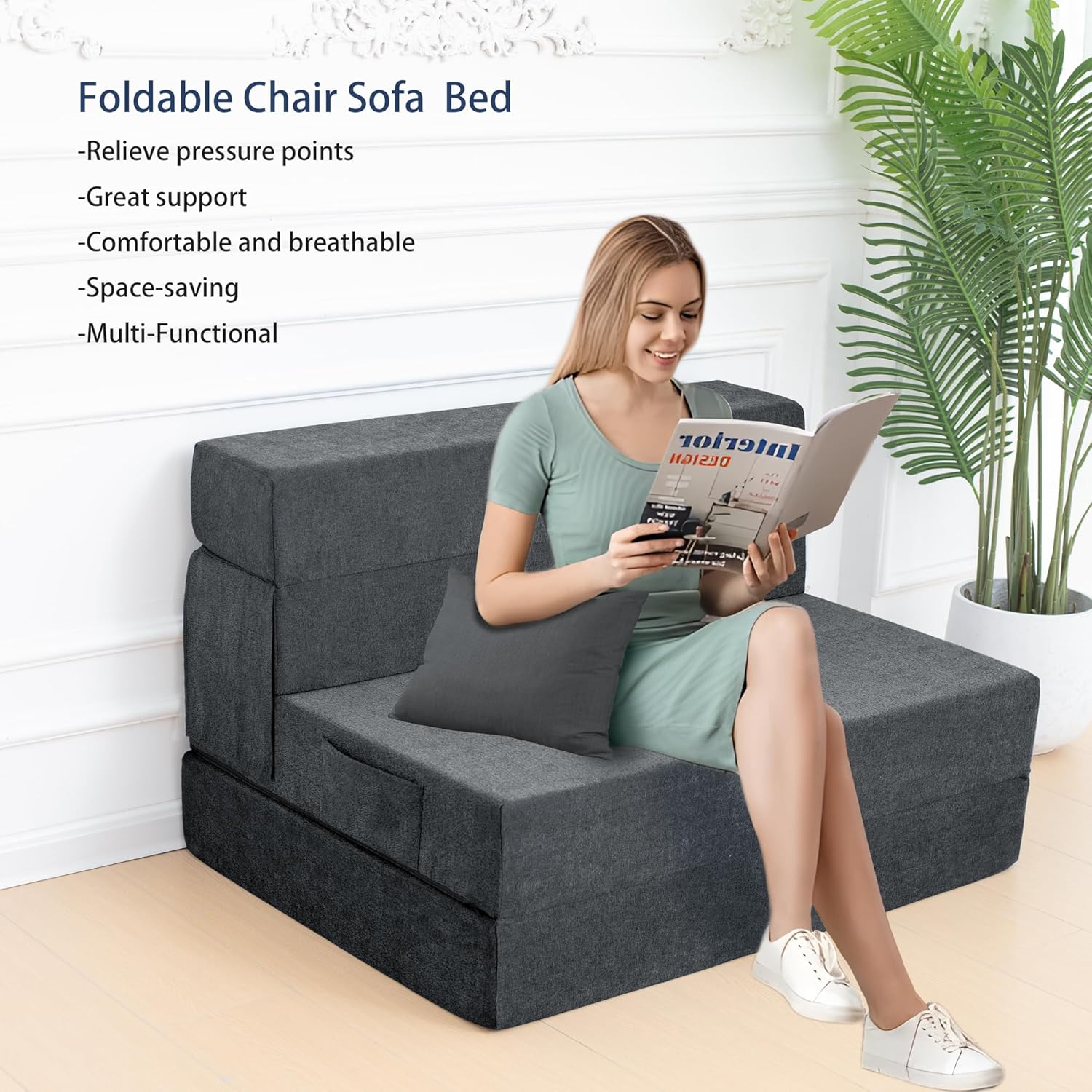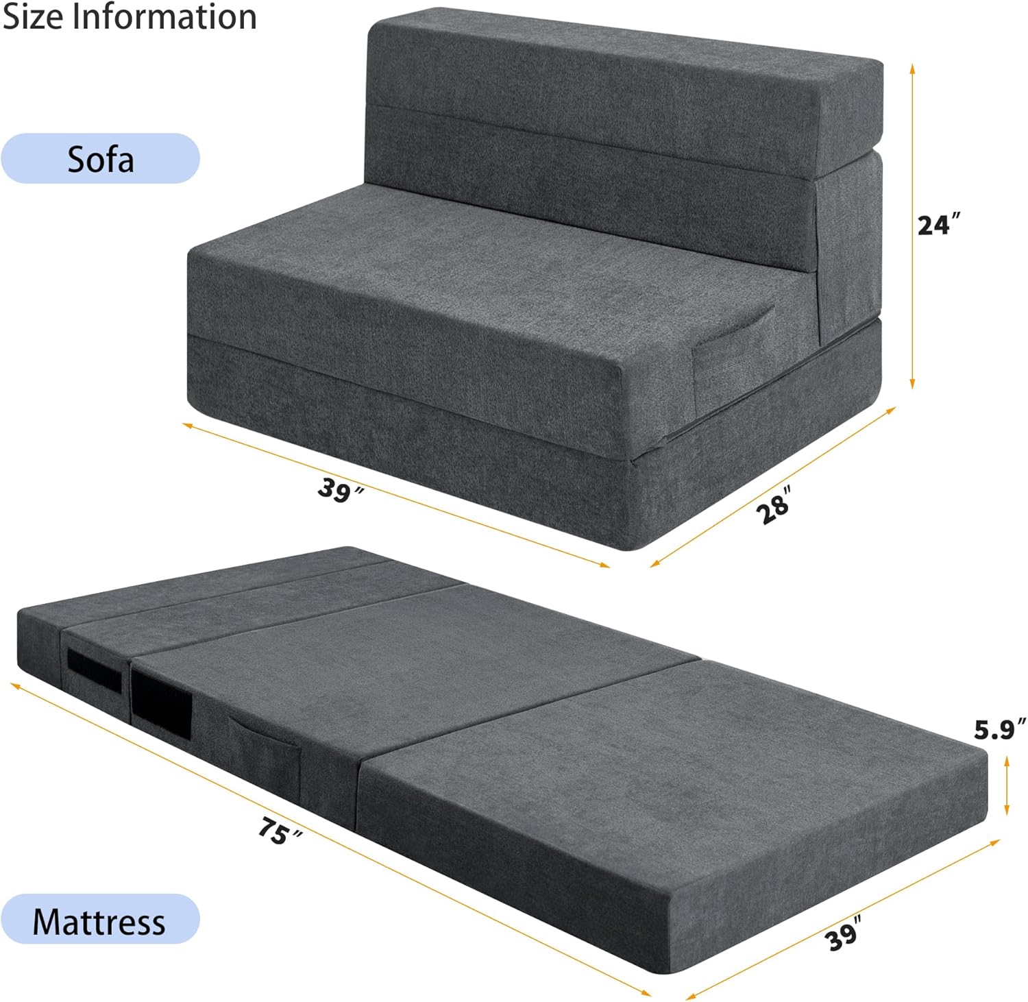 - Tela y espuma de alta calidad: la tela transpirable gris oscuro es elegante y elegante, agradable al tacto y transpirable. El sofá cama de espuma de alta densidad es muy cómodo, suave y de apoyo, por lo que no se "hundir" ni sentirá el piso duro.