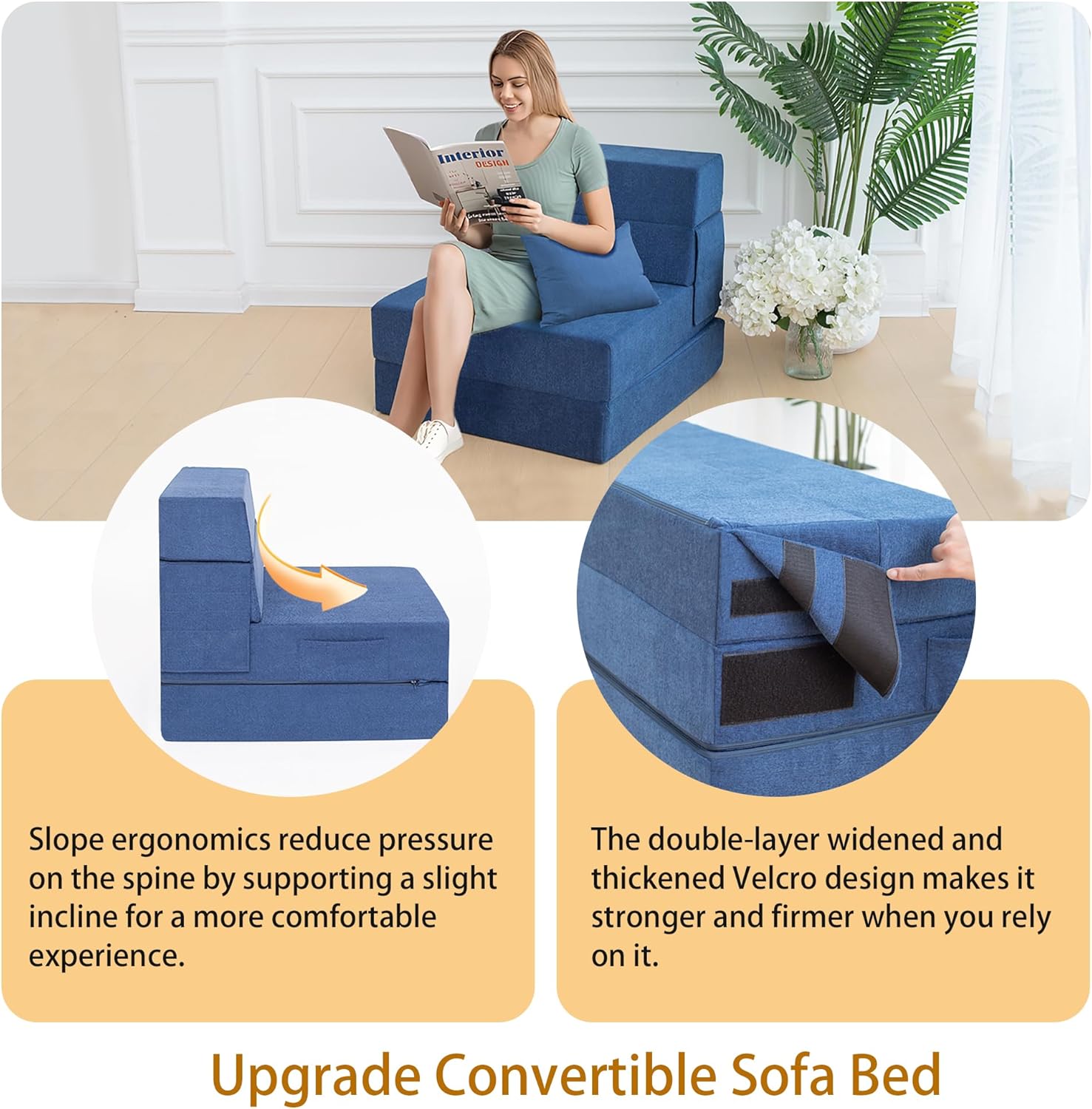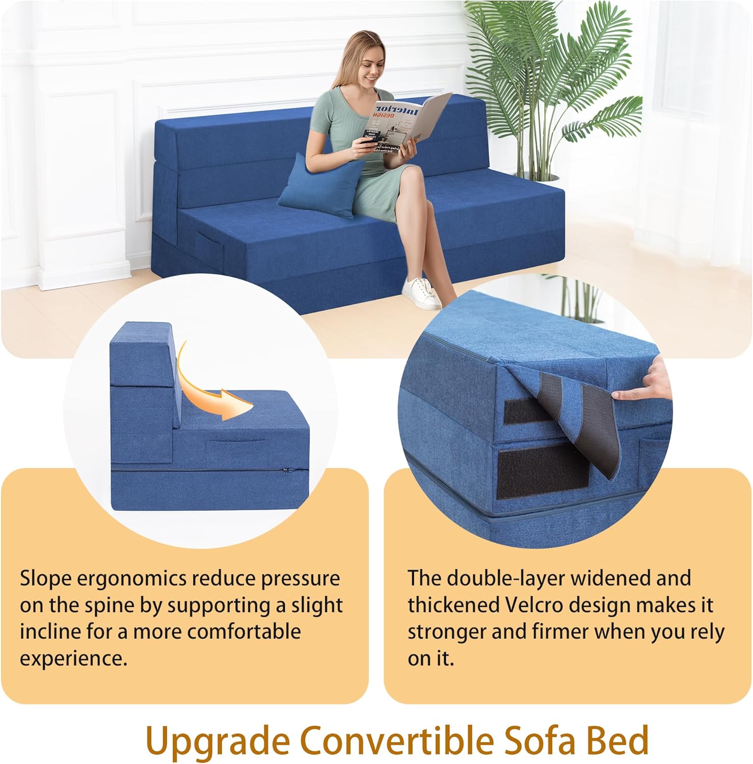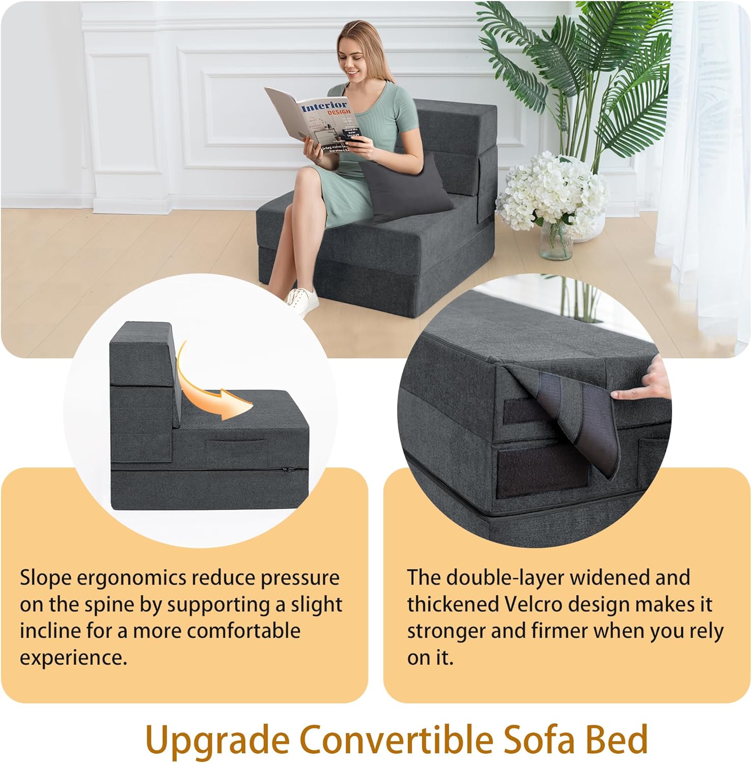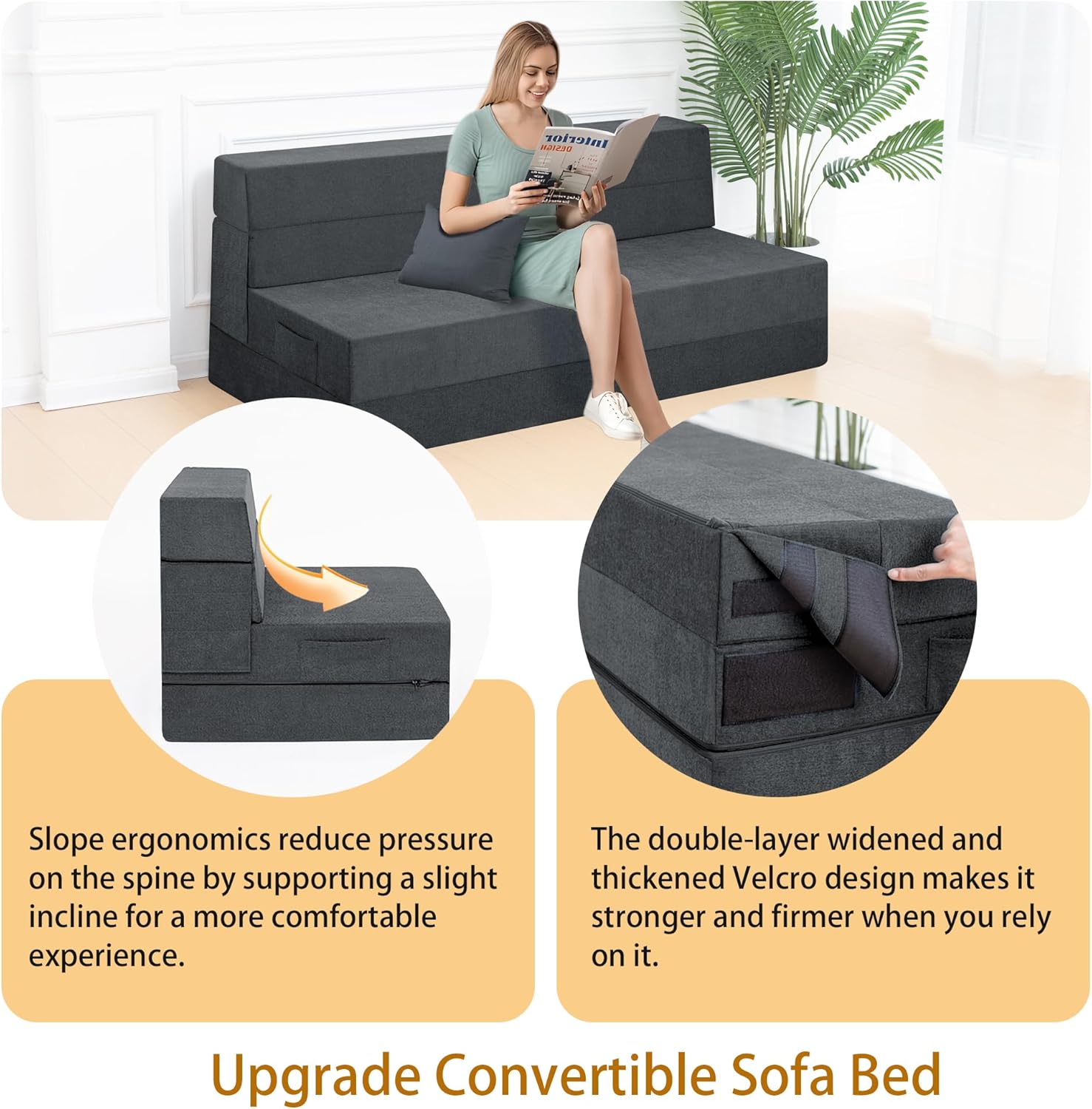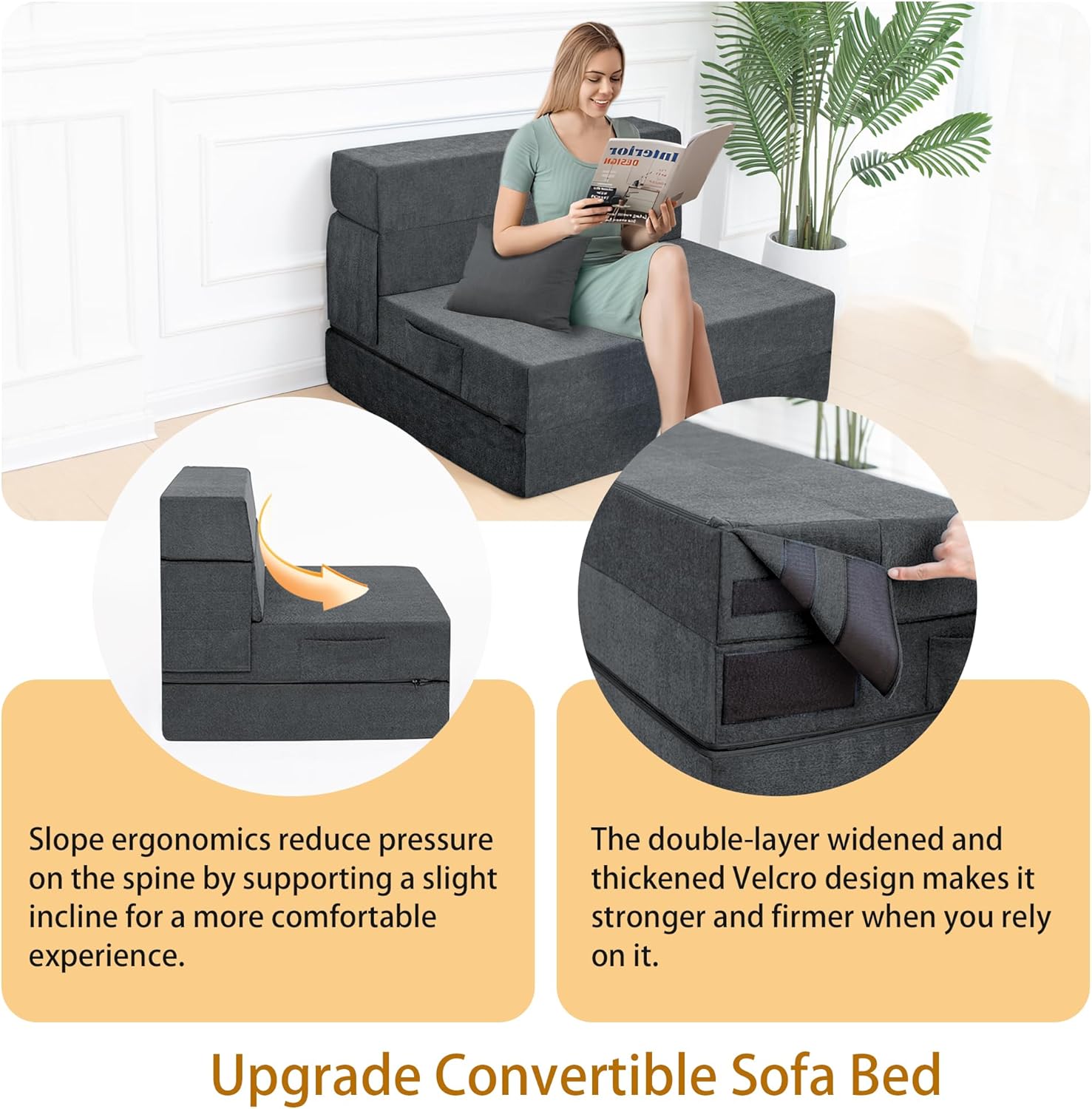 - Diseño ergonómico mejorado: el sofá cama convertible se adapta perfectamente a la curva del cuerpo y la almohada incluida puede proporcionar un mejor apoyo para tu espalda baja, por lo que no te sentirás cansado ni siquiera sentarte en este mueble de futón durante mucho tiempo. Además, utilizamos un diseño de cinta de velcro ensanchada y alargada. Cuando se convierte en un sofá, es más sólido para apoyarse y no se pliega fácilmente