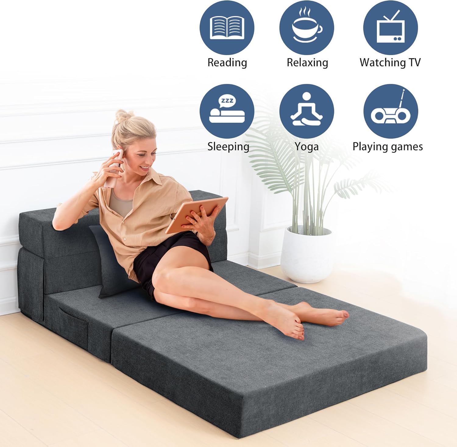 - Sofá cama plegable multifuncional: esta silla de cama plegable de tamaño queen se convierte fácilmente en un sofá de piso, silla, sillón reclinable y cama. Es ideal para proporcionar una postura excepcionalmente cómoda al leer, navegar por Internet, ver televisión, hacer ejercicio, etc. Perfecto para relajación personal, yoga, leer, jugar, ver películas o colchón plegable de sofá para invitados inesperados.
