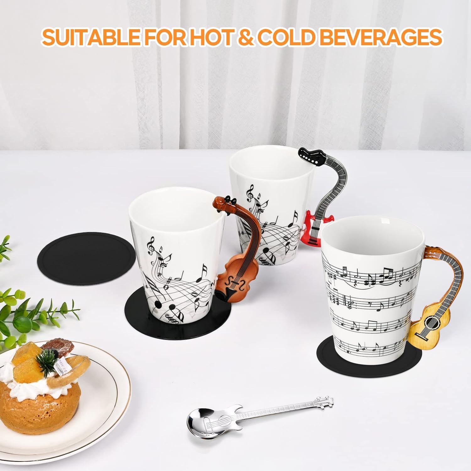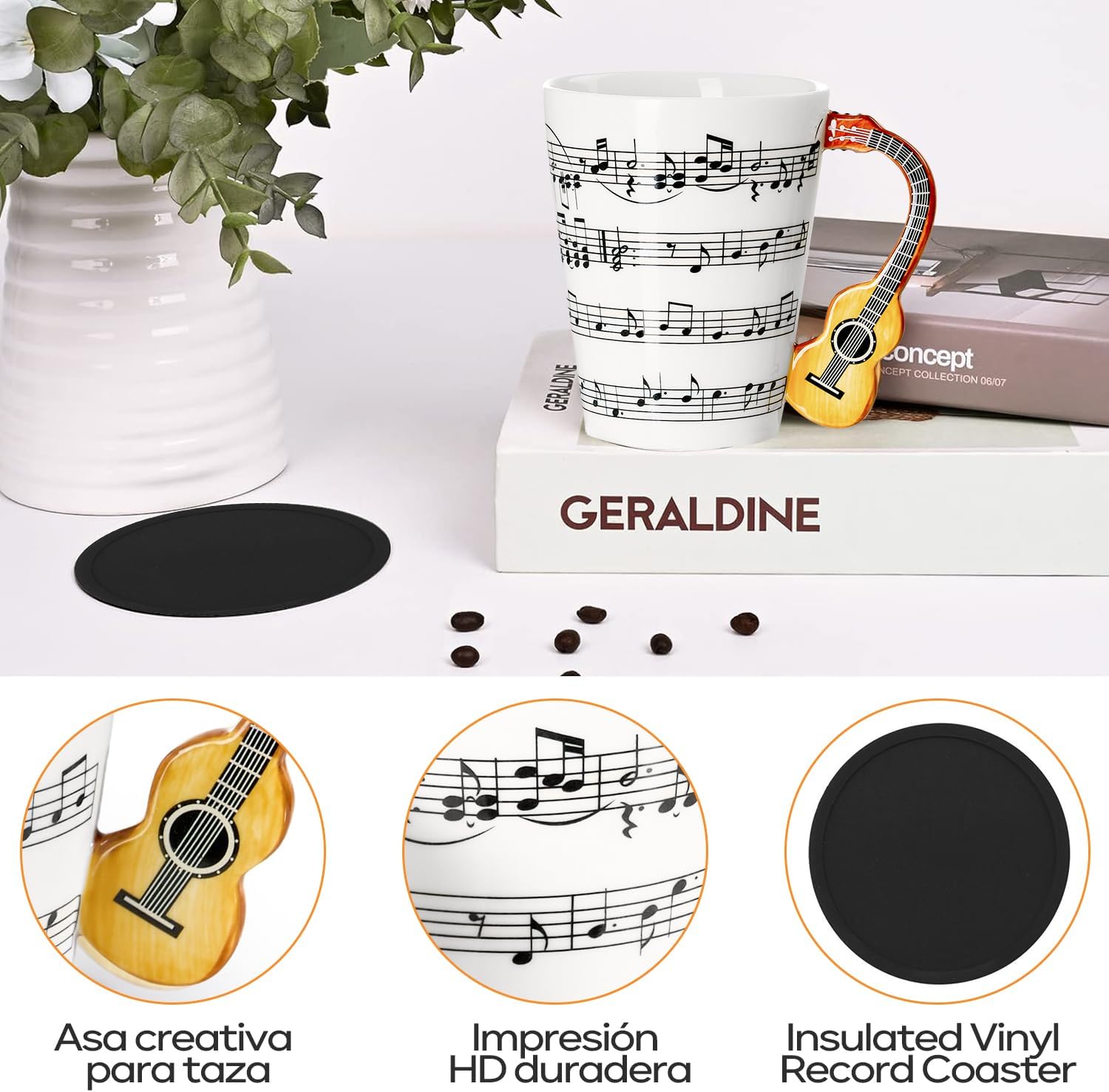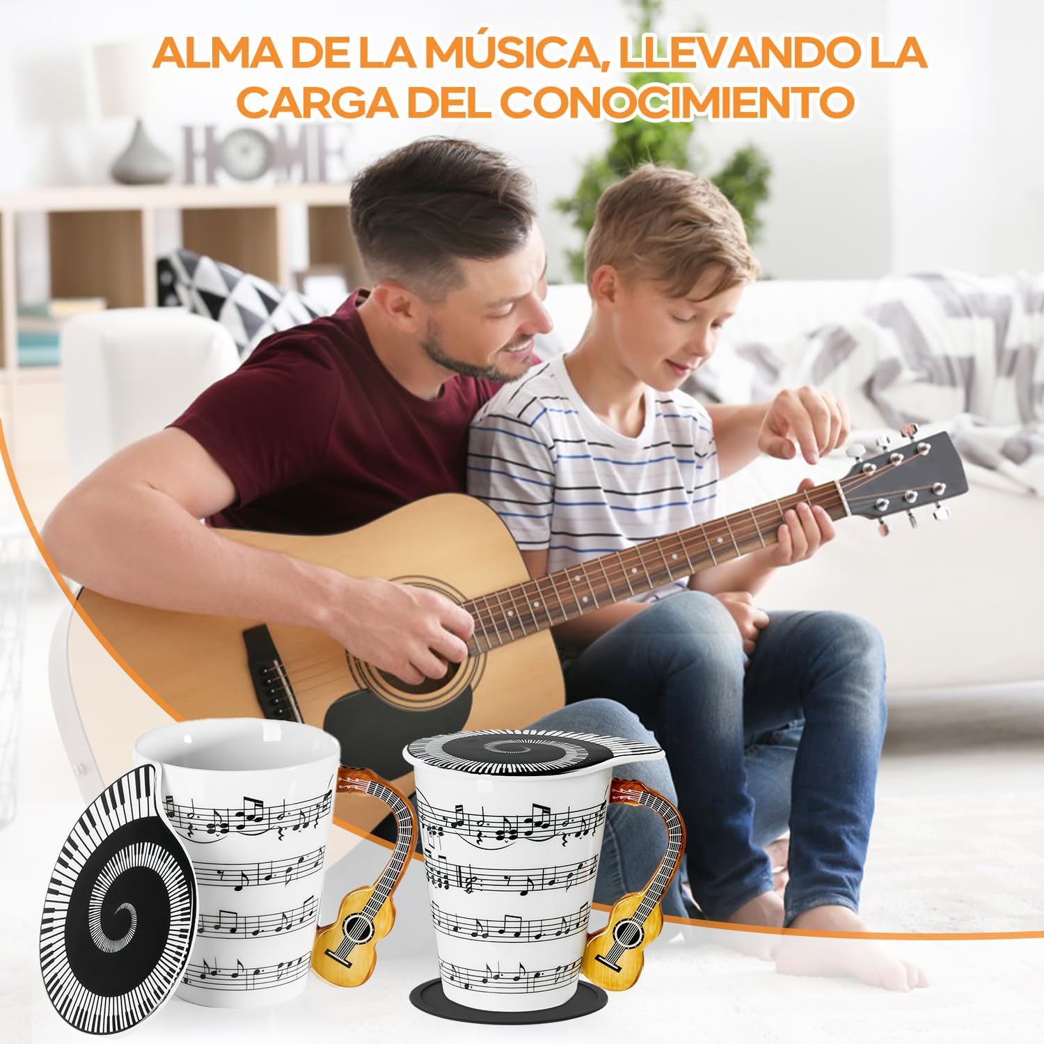 - ♫【Taza de guitarra】RAMSPIT taza ceramica de diseño único es una pieza musical. La taza tiene un diseño temático de notas musicales y el asa tiene forma de guitarra, además, el juego también viene con una bonita cuchara en forma de guitarra, y también se incluye una cubierta/posavaos con temática musical.
